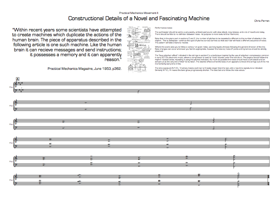Thanks to a beautifully-typeset score, the album can be performed by anyone with ready access to junk percussion, a sampler, a piano and a string quartet. Perren ingeniously overcomes the notational clutter of long, syncopated “simile” passages by giving each instrument’s cell, number of repetitions and cues in relation to the other instruments. The score is also a great pleasure to read alongside the album, with the notation realising the love of mysterious technical geometry proper to the period.