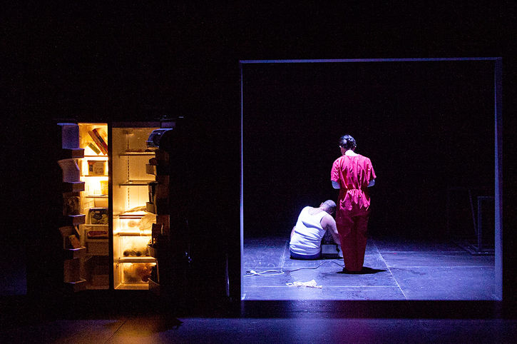 Entering the theatre one can just make out dark stains on the stage floor. Drop by drop a puddle of water forms between three monolithic black cubes. Occasionally a tone like struck metal rings out. The sounds rise and fade, accompanied by the dead percussion of wood.