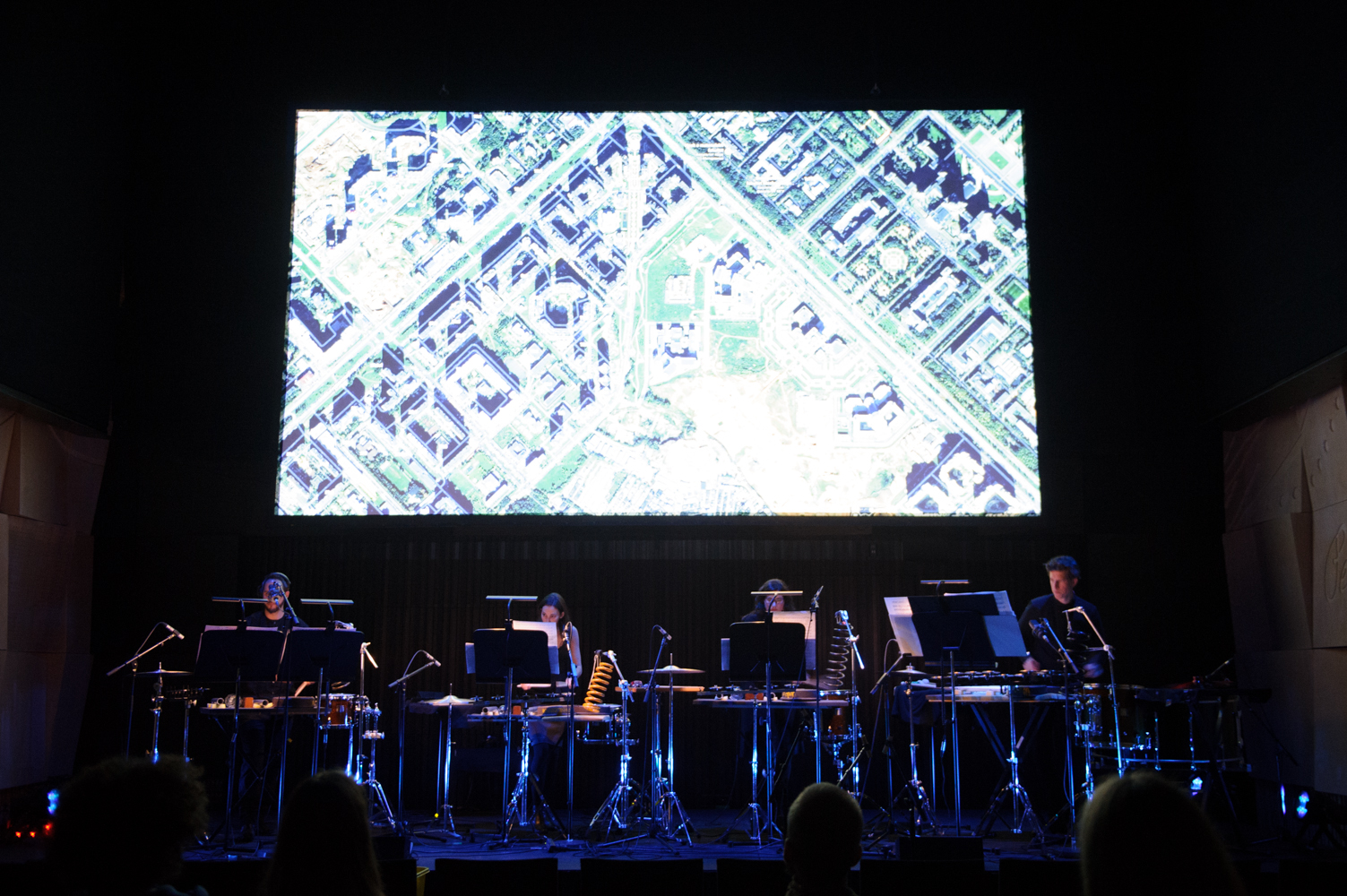 Once ushered into the Salon, we were treated to Jeanette Little’s No Optic for four percussionists and live electronics. The piece is accompanied by a video work by the Russian video artist Sasha Litvintseva. The video features a screenshot of somebody exploring high-resolution Google Maps images of various metropolises. In a reference to online and CCTV surveillance, copies of the screenshots are then dragged onto the screen, producing a multiplicity of staggered images. Scrolling cascades of images of roads and cars pass over the screen. The layering process is repeated with a video of somebody taking a photo with a smartphone. I appreciated that this was a video made almost entirely (if not actually entirely) without a camera. The moving image is now omnipresent, with almost every possible setting and activity recorded and uploaded into the cloud (or into some server farm in a desert). However, I was more amused than scared by the “electronic panopticon” (as it was described in the programme). This may be due to Little’s score, which aimed to conjure mixed feelings of “intimacy, discomfort, anxiety and opportunity.” The four percussionists, Ughetti, Kaylie Melville, Anna Camara and Matthias Schack-Arnott, stood behind four almost identical batteries of metal percussion. They produced beds of sound, like the high-pitched rattling of skewers on metal pipes. At other points the ensemble signalled important transitions. For instance, tiled videos of the interiors of trains give way to a single long-range shot of a city with a train passing through it in the distance. The performers stop suddenly, the resonance of car suspension springs ringing out into the calm. The pre-recorded materials, including loud dance music or a sacred classical-era aria, highlighted the omnipresence of recorded sound in our lives as well as recorded images.